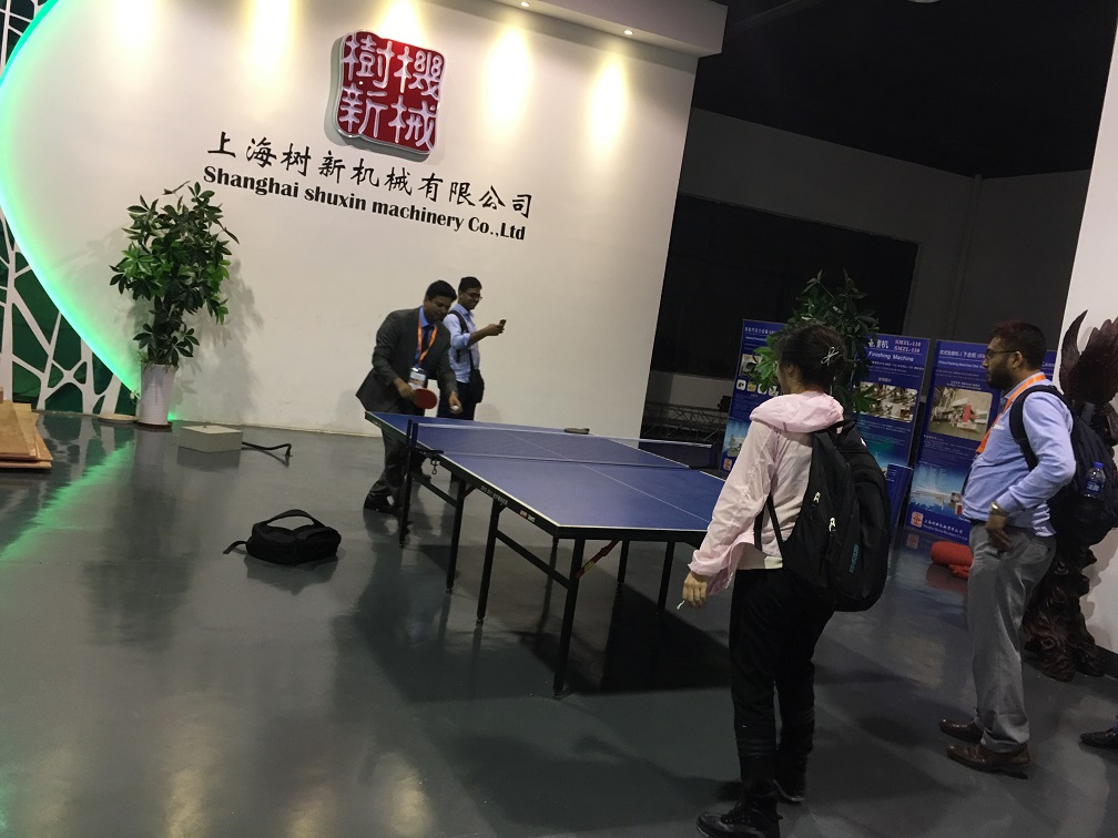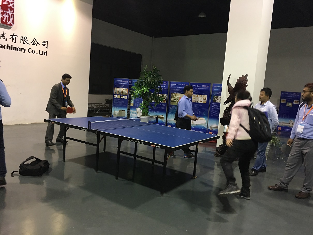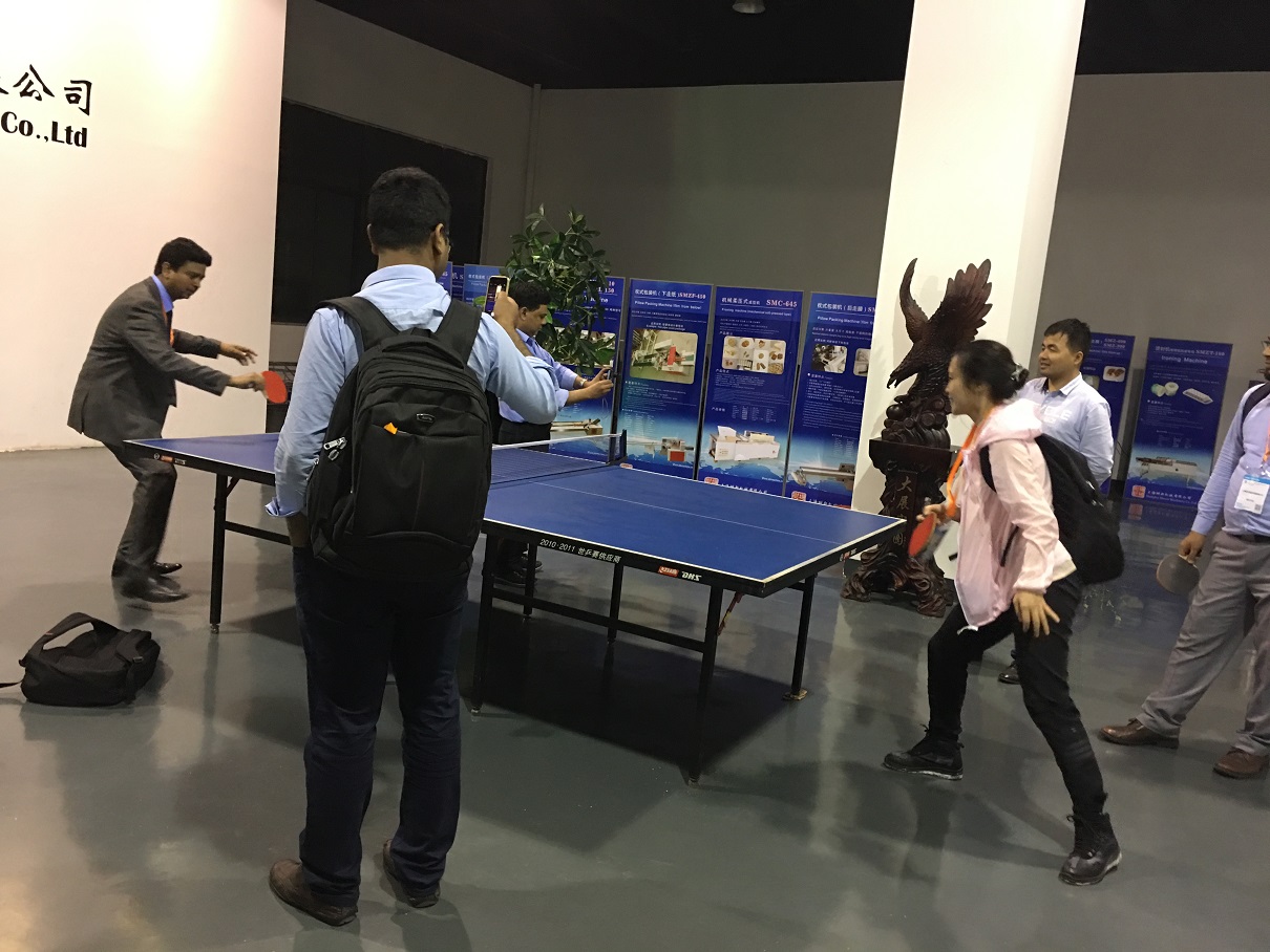 昨日印度客人一行4人,到访我公司,现场做了测试, 对我们的成型机,膨化机,包装机这一整套设备很满意,当他看到我们的乒乓球桌时候,兴致更高,忍不住露了一手,原来他们打乒乓球也挺厉害的。